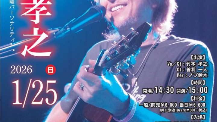 お陰様で44周年 本年竹本孝之は「還暦」を迎えます。「乙巳」の今年は、粘り強く着実に歩みを進めて参ります。皆様のご多幸とご健勝をお祈りしつつ 2025年 竹本 孝之 メディア・イベント・講演会等出演のご依頼はこちら NEWS 2025.6.21 RELEASE 「そんなヤツであれ」 Crossroads of life tour 2025 竹本孝之 大忘年会 シーズン16 【日時】 2025年12月6日(土)11:30開場 12:00開演ライブポケットチケットにて受付https://t.livepocket.jp/e/takemoto_dai-bounenkai-season-16 竹本孝之Crossroads of Life tour 2025 FINAL inTokyo 【日時】 2025年12月6日(土)17:00開場 17:30開演ライブポケットチケットにて受付https://t.livepocket.jp/e/takemoto-takayuki-live2025_final 竹本孝之配信スペシャルライブ竹本孝之 2025 カウントダウン in 竹本さん家 【日時】 2025年12月31日(水)22:00開演ツイキャス公式ストア「キャスマーケット」にて受付https://twitcasting.tv/c:takeboss/shopcart/404948 The next schedule will be announced soon! Don't miss it! Crossroads of life tour 2026 竹本孝之Crossroads of Life tour 2026 埼玉・北坂戸 【日時】 2026年1月25日(日)14:30開場 15:00開演12/7よりライブポケットチケットにて受付https://livepocket.jp/e/t-takemoto-tour2026-kitasakado Recent posts 2026.1.25竹本孝之 Crossroads of Life tour 2026 in 埼玉・坂戸 12月 1, 2025 Off 2025.12.31竹本孝之 2025 カウントダウン in 竹本さん家 11月 18, 2025 Off 2025.12.6竹本孝之 Crossroads of Life tour 2025 FINAL in 東京 10月 8, 2025 Off 2025.12.6竹本孝之2025大忘年会シーズン16!! 10月 8, 2025 Off REGULAR PROGRAM All TV RADIO INTERNET マチコミ毎週木曜日 16:30TVSテレビ埼玉「マチコミ」パーソナリティ 竹本孝之 Song for TOMORROW調布FM 83.8mHz毎週火曜日 21:30「竹本孝之 Song for TOMORROW」ネット局もあります! TwCasわぃやで~(^^)vシンガー竹本孝之「本人」が語る日々のくだらない事。。。こんな時だから、気軽に雑談しましょう! I LOVE MY FANS THANK YOU FANS 公式ファンクラブはコチラ いつも応援ありがとう。共に笑顔で『旅』をしよう。 NEW ALBUM 2024年4月28日に開催された「59th Anniversary Live」その全てを余すことなく収めたアコースティックライブアルバム 動画再生 「My Journey vol.1」ご購入はコチラ 動画再生 「My Journey vol.2」ご購入はコチラ YOUTUBE 竹本孝之公式YouTubeチャネル FACEBOOK instagram threads YOUTUBE X TwitCasting 事務所公式Facebookpage office tomorrowからの情報発信です。 ライブ情報Facebookpage ライブ情報専用情報発信FBです。 事務所公式instagram office tomorrowからの情報発信です。 事務所公式X office tomorrowからの情報発信です。 ライブ情報X ライブ情報専用情報発信Xです。 LIVE HISTORY ライブ情報・ヒストリー 2026.1.25竹本孝之 Crossroads of Life tour 2026 in 埼玉・坂戸 … 2025.12.31竹本孝之 2025 カウントダウン in 竹本さん家 … 2025.12.6竹本孝之 Crossroads of Life tour 2025 FINAL in 東京 … 2025.12.6竹本孝之2025大忘年会シーズン16!! … NOW RELEASE For Your Songs OFFICIAL SHOP My Journey vol.1 My Journey vol.1 竹本孝之『My Journey vol.1』2024年8月1日発売2024年4月28日に50代最後の誕生日を迎える際に開催した、59th感謝祭・Anniversary Liveの模様を収録したライブアルバム(前半)です。-収録曲-てれてZinZinとっておきの君ハリケーン俺達の疾走少年時代HOLD ME風に向かって 1979夏SAHARAの風 My Journey vol.2 My Journey vol.2 竹本孝之『My Journey vol.2』2024年8月1日発売2024年4月28日に50代最後の誕生日を迎える際に開催した、59th感謝祭・Anniversary Liveの模様を収録したライブアルバム(後半)です。-収録曲-RUN TO LIVEファイヤーBIG SCREEN愛の唄風に吹かれて冬ざれの夜空Down to the RiverPerfect WorldAlways暁縁ing About 竹本孝之 office TOMORROWは、弊社所属アーティストのマネジメントをはじめ、各種エンターテインメントの企画・制作を行っております。ライブ開催講演会、講演会+ミニライブTV/ラジオ出演CM・PV制作等配信イベント・配信ライブ企画制作等〒160-0022東京都新宿区新宿4-1-22 新宿コムロビル7F2号出演・企画のお問い合わせは以下よりお願い致します (担当:高橋) お問い合わせはコチラ