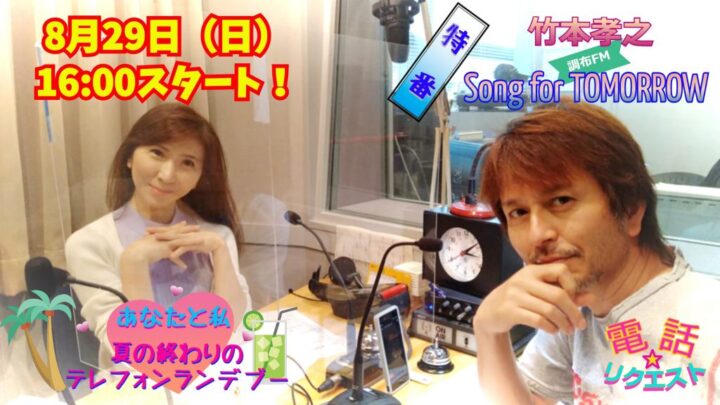 調布FMをキーステーションに全国20局ネットで絶賛OA中の 竹本孝之の軽快なトークと、心にしみる歌声をお楽しみいただける愉快な ※自称※音楽番組! 「竹本孝之 Song for TOMORROW」の特番…