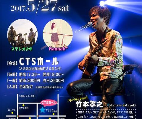 『CTS アコースティック LIVE 2017』 竹本孝之出演決定いたしました。 [期日] 2017.5.27(土) [出演] 竹本孝之 / ステレオ少年 / Hannah [会場] CTSホール (大分県) [お問い合…