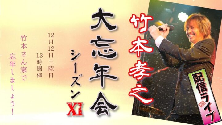 配信イベント 竹本孝之大忘年会シーズン11!! ~竹本さん家で忘年しましょう~ 【日時】2020年12月12日(土) 13:00開演 ※開催日当日のみアーカイブ御視聴頂けます 【総合司会】松田泰子 【ゲス…
