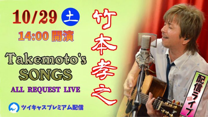 竹本孝之配信スペシャルライブ Takemoto‘s SONGS ALL REQUEST LIVE 【出演】 竹本孝之 【日時】 2022年10月29日(土) 14:00開演 【配信メディア】 TwitCasting(ツイ…