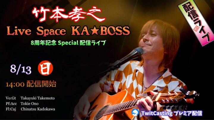 竹本孝之 配信 Live 「Live Space KA★BOSS」 8周年記念SPECIAL企画vol.Ⅱ 【出演】 Vo:Gt Takayuki TakemotoPf:Acc Tokie Ono …