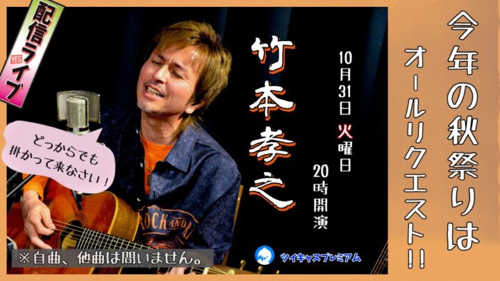 竹本孝之配信スペシャルライブ 『竹本さん家で秋祭り2023 All Request』 Ticket購入の際、メッセージ欄より竹本に歌って欲しい1曲を御記入ください。 ※採用されるか否かは、竹本次第となります。予め御了…