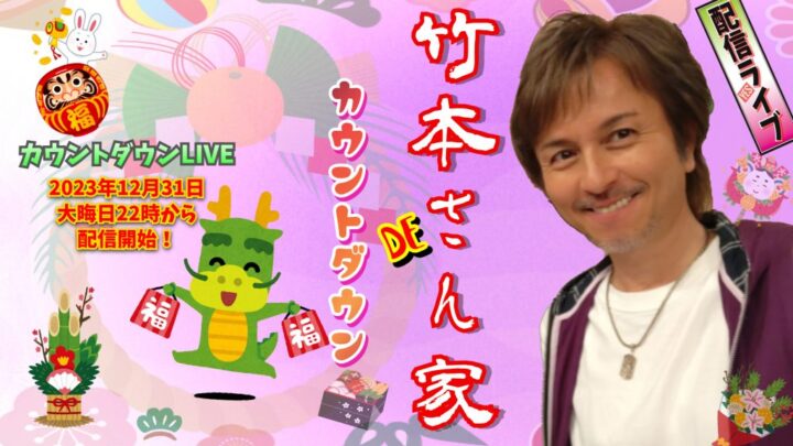配信竹本孝之配信スペシャルライブ 竹本孝之 2023 カウントダウン in 竹本さん家 2023年のラストを飾るカウントダウンライブ!飛躍した兎さんを感謝で見送って、伝説の神獣『辰』さん(こう表記すると落語見たいです…